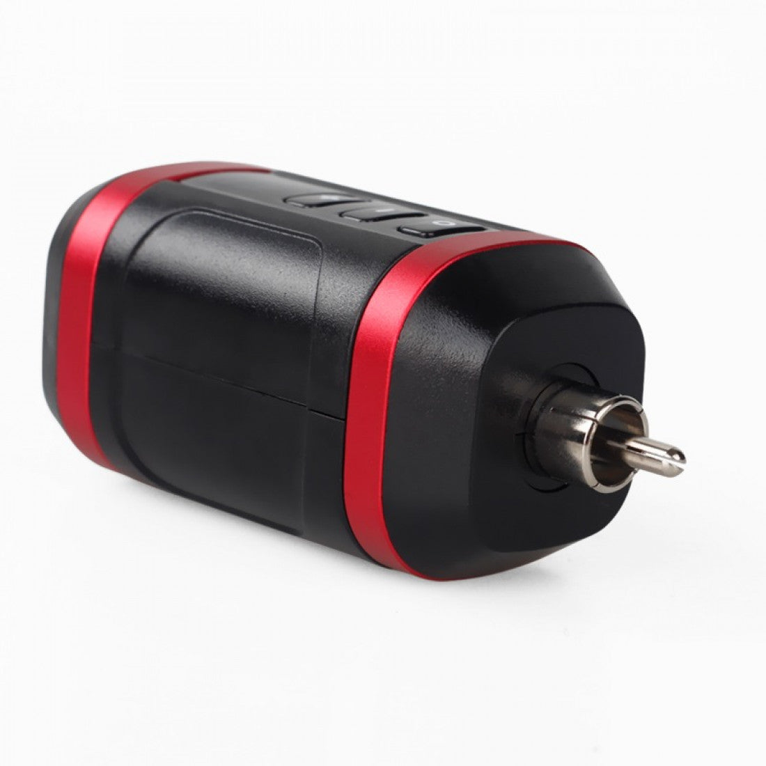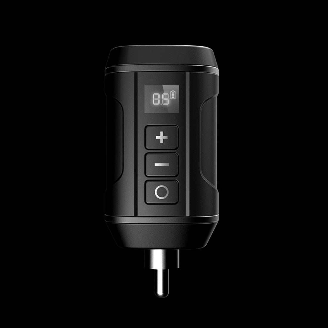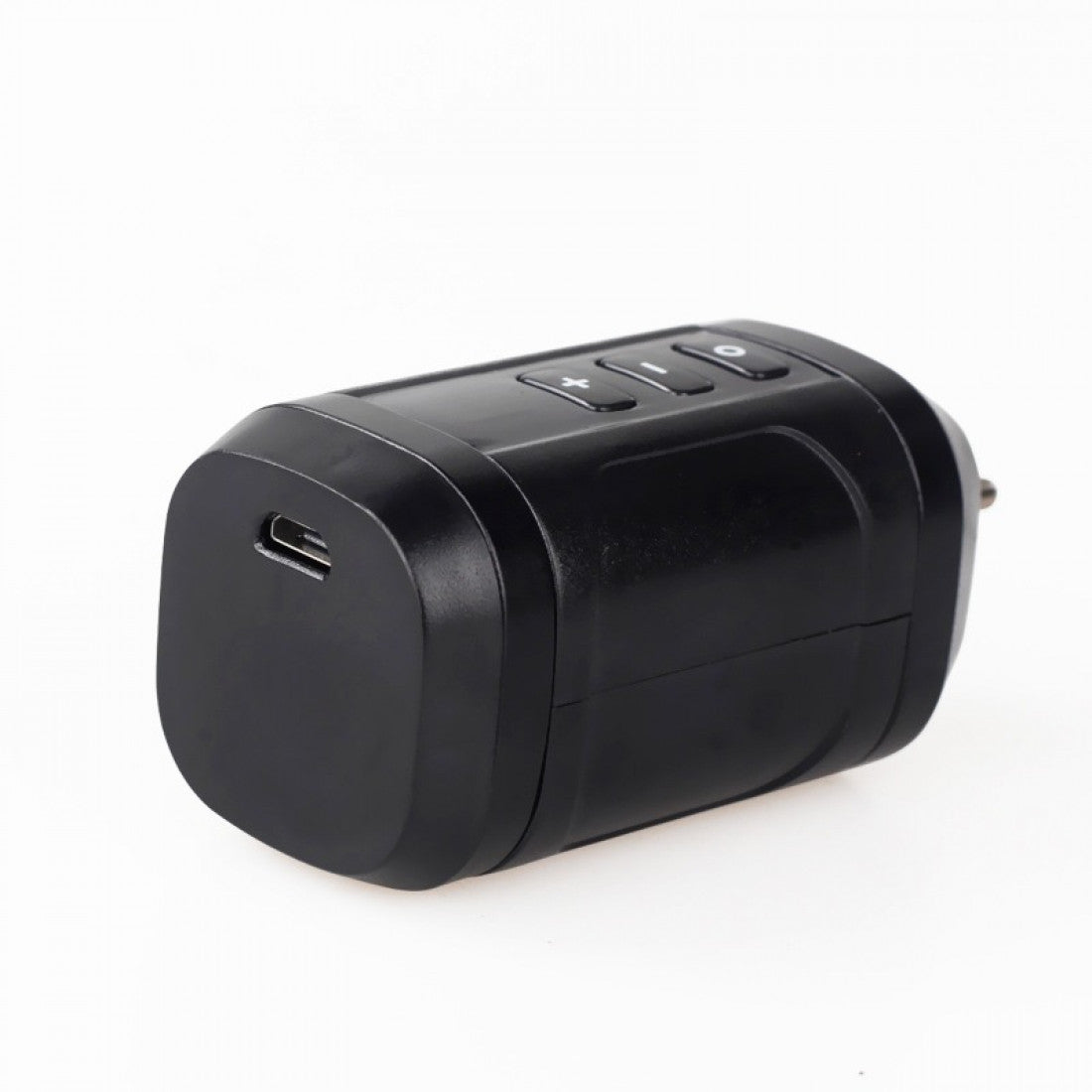 The device is a tattoo power supply, with input port, output port, built-in lithium battery, external switch button, voltage adjustment button, pause button, LCD screen, and the specific functions are as follows: